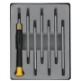 Visokokvalitetni odvijač sa 7 reverzibilnih noževa s ručkom u praktičnoj plastičnoj kutiji s prozirnim poklopcem. Utor 2/3/4 mm · Phillips tip Philips 00/0/1 · T-profil T5 / T6 / T7 / T8 / T9 / T10 / T15 / T20.