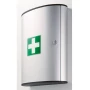 Veliki ormar za prvu pomoć, napunjen za komercijalnu upotrebu (za administrativne i komercijalne tvrtke do 50 zaposlenika, proizvodne i prerađivačke tvrtke do 20 zaposlenika ili gradilišta do 10 zaposlenika). Unutar tri okretna odjeljka za zavoje. Dodatni indeksni list za važne telefonske brojeve za hitne slučajeve. Kutija se može identificirati s isporučenim bijelim križem za prvu pomoć na zelenoj podlozi. Metalna brava s dva ključa. Boja: metalik srebrna. Isporuka sa setom za montažu na zid.