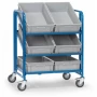 Kolica s policama - nosivost 200 kg okvira: - zavarena čelična konstrukcija - prašno lakirana površina - trajna površinska zaštita, otporna na udarce i ogrebotine. Podovi: - 3 kata - Otvoreni okvir - Podovi se mogu uvrstiti na rešetku od 50 mm - Nagib za naginjanje na 15 ° ili 30 ° - Nosivost srednje i gornje etaže 60 kg. Oprema: - 6 kutija. Gume: - Kotači s čvrstim gumama na gumenim čeličnim naplatcima - 4 okretna kotača, od kojih 2 s kočnicama. Ležajevi kotača: - Glavčina s valjkovim ležajevima.