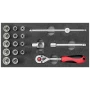 Četvrtasti spoj prema DIN 3120 - C 10, ISO 1174, s utorom za zahvaćanje kuglice. Unutarnji kvadratni pogon prema DIN 3120 - C 10, ISO 1174, s utorom za hvatanje kuglice. 2K reverzibilna čegrtaljka 3/8": rotacija u smjeru kazaljke na satu/lijevo može se mijenjati pomoću poluge, otključavanje pritiskom na gumb, fino nazubljena, ovalna glava, 2-komponentna ručka. Umetci za nasadne ključeve 3/8" 6-točkovni: metrički, kratki, izvedba prema DIN 3124, ISO 2725. Nasadni ključ 3/8" 125 mm. T-ručka s klizačem 3/8": Dizajn prema DIN 3122, ISO 3315. Povećač 3/8" do 1/2". Krom-vanadij čelik, mat satin kromiran. Za kutije za odvrtanje na ručni pogon. U modulu pjene
