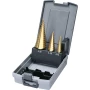 Longlife HSS set stepenastih svrdla za metal od titana koji se sastoji od 3 svrdla s premazom od titana i ravnim utorom u kutiji: