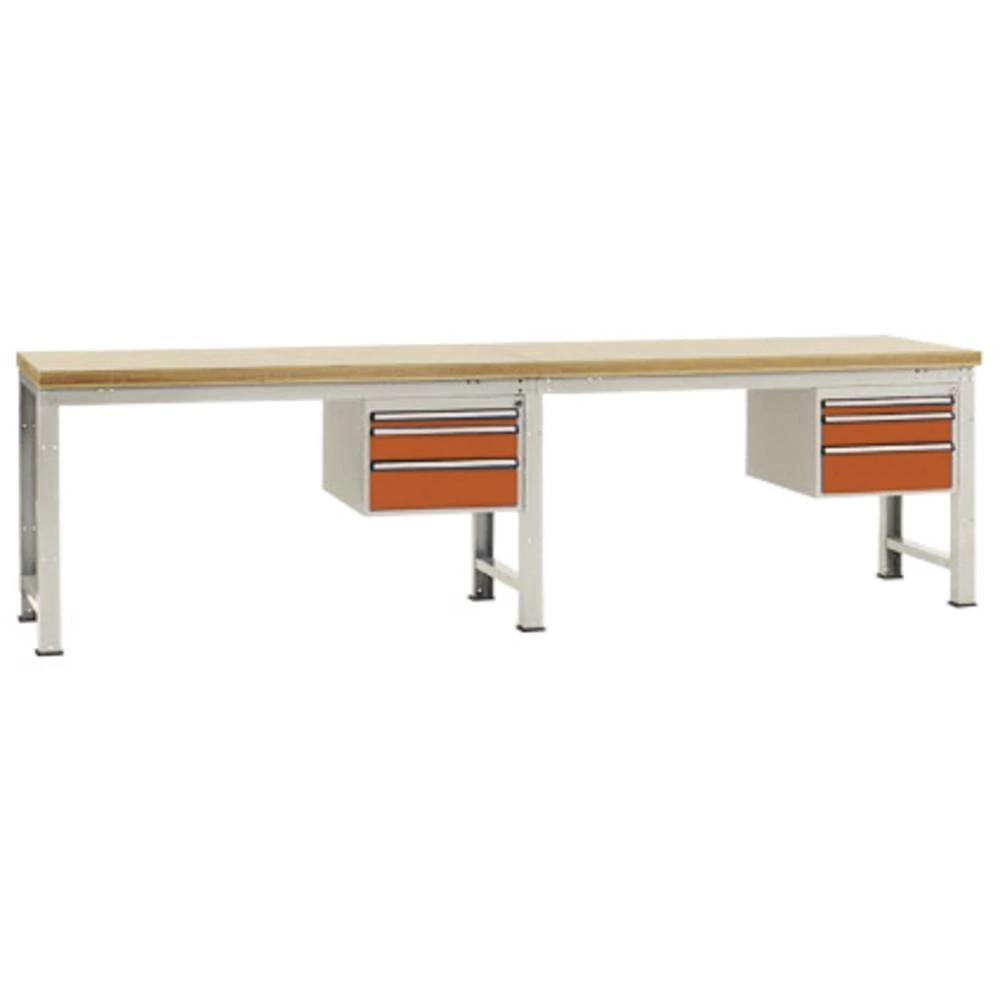 Uštedite si dugog traženja i mukotrpne montaže pojedinih dijelova radnog stola, iskoristite naše iskustvo! S PROFI radnim stolom u provjerenom i jeftinom asortimanu koji su sastavili naši stručnjaci, stvarate optimalnu osnovu za radno područje. PROFI radni stol može se koristiti kao pojedinačni ili kao serijski radni stol. Ovdje će svoje mjesto naći posebno rad s velikim mehaničkim naprezanjima, ali također se pomoću PROFI radnog stola mogu izvesti potpuno opremljene radne stanice za proizvodnju ili montažu zahvaljujući širokom rasponu dodatne opreme. PROFI Standardni radni stol u crveno-narančastoj boji RAL 2001, širine 4000 mm i dubine 700 mm, izuzetno je stabilan i izdržljiv zahvaljujući samonosećem čeličnom okviru. Visina je 800 mm plus radna ploča. Zbog vrlo velike nosivosti od 700 kg (s ravnomjernom raspodjelom tereta), radni stol je idealno pogodan za velika mehanička opterećenja u proizvodnji ili montaži. Samonosivi okvir sastoji se od 2 okvira od čeličnog profila 60 x 60 mm i 2 stabilna okvira visine 60 mm, kao i gumene cipele (6 mm) za zaštitu podne obloge. Okvir je visokokvalitetno premazan prahom u crveno-narančastoj boji RAL 2001. Nauljena multipleks ploča za stol debljine 40 mm, širine 4000 mm i dubine 700 mm, sastoji se od bukove višeslojne ploče kvalitetne klase I / III u skladu s DIN 68705, dio 2. Multiplex ploča stola zalijepljena je križno i vodootporna prema DIN 68705 IF (IW67) i podmazana na okoliš. Svi rubovi i uglovi su brušeni i ukošeni. Na zahtjev je moguć prozirni sloj multiplex ploče. Multiplex ploča stola koristi se svugdje gdje su potrebna velika mehanička opterećenja, kao što je u području montaže i proizvodnje. Zbog lijepljenja, ploča stola može se koristiti i za povremeni rad s vlažnim materijalima. Opseg isporuke uključuje bazu kućišta s ladicama. Podkonstrukcija se koristi za inteligentan i uredan red na radnom mjestu. Ima širinu od 500 mm, dubinu od 580 mm i visinu od 360 mm. Kućište se sastoji od čvrsto ojačane čelične konstrukcije, visokokvalitetnog praškastog premaza u crveno-narančastoj boji RAL 2001. Kućište može biti opterećeno do 200 kg. Kućište je opremljeno cilindričnom bravom i 2 ključa, kao i središnjom bravom. Kućište ima korisnu visinu od 300 mm i sastoji se od 2 ladice svaka s visinom panela 1 x 50 mm, 1 x 100 mm, 1 x 150 mm. Ladice se mogu izvući do 80%, a mogu se napuniti do 35 kg. Ladice su opremljene velikom šipkom ručke i dodatnom naljepnicom za označavanje ladica. Uz to, kućište je opremljeno jednom izvlačnom bravom. To sprječava nenamjerno, istovremeno otvaranje nekoliko ladica i na taj način smanjuje rizik od prignječenja i ozljeda.