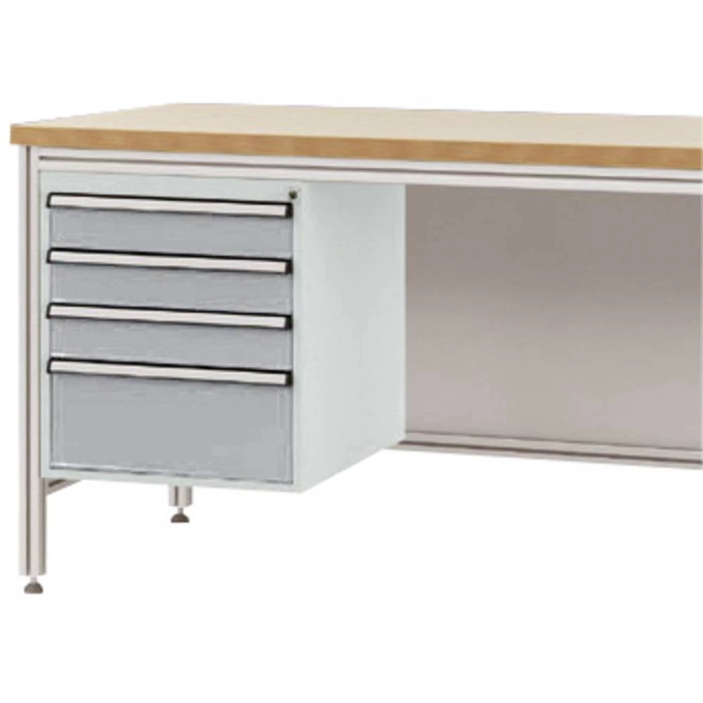 Kompletna potkonstrukcija kućišta za radni stol ALU. Za inteligentan i uredan redoslijed na radnom mjestu širine 500 mm, dubine 580 mm i visine 560 mm. Kućište se sastoji od čvrsto ojačane čelične konstrukcije, visokokvalitetnog praškastog premaza aluminijskim srebrom RAL 9006. Kućište je elastično za sve radne stolove ALU do 200 kg. Kućište se može koristiti na ALU radnim stolovima s dubinom stola od 800 mm. Kućište je opremljeno cilindričnom bravom i 2 ključa, kao i središnjom bravom. Kućište ima korisnu visinu od 500 mm i sastoji se od 4 ladice s visinama prednje ploče 3 x 100, 1 x 200 mm. Ladice se mogu izvući do 80%, a mogu se napuniti do 35 kg. Opremljeni su velikom šipkom ručke i dodatnom naljepnicom za označavanje ladica. Uz to, kućište je opremljeno jednom izvlačnom bravom. To sprječava nenamjerno, istovremeno otvaranje nekoliko ladica i na taj način smanjuje rizik od prignječenja i ozljeda. Napominjemo da se na jedan stol može pričvrstiti samo jedna potkonstrukcija kućišta.