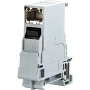 Mrežna utičnica u obliku prekidača. Utič utičnice je potpuno oklopljen i odobren za CAT 6. Kutija je montirana na standardne DIN šine poput osigurača. Smjer priključite 90 ° na gornju šinu šešira.