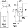 U-stezaljka s bazom glave čekića, metalna tlačna posuda sa zaobljenim rubovima za zaštitu kabela. Za vertikalnu i horizontalnu montažu 1 pojedinačnog kabela na C-profilnu šinu. Za širinu proreza 16 - 17 mm. S 1-pokretnim vijkom na tlačnom spremniku, univerzalna šesterokutna glava vijka SW10, s utorom i križnim utorom. Pogodan za unutarnju i vanjsku montažu. Kontra korito se mora posebno naručiti.