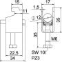 U-stezaljka s N-nogom, plastična tlačna posuda od polipropilena. Za vertikalnu i horizontalnu montažu 1 pojedinačnog kabela na C-profilnu šinu. Za širinu proreza 11 - 12 mm. S 1-pokretnim vijkom na tlačnom spremniku, univerzalna šesterokutna glava vijka SW10, s utorom i križnim utorom. Pogodan za unutarnju i vanjsku montažu. Preporuča se korištenje kontra ladice.