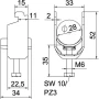 U-stezaljka s N-nogom, plastična tlačna posuda od polipropilena. Za vertikalnu i horizontalnu montažu 1 pojedinačnog kabela na C-profilnu šinu. Za širinu proreza 11 - 12 mm. S vijkom za 1 start na tlačnoj posudi, univerzalna šesterokutna glava vijka SW10, s utorom i križnim utorom. Pogodan za unutarnju i vanjsku montažu. Preporuča se korištenje kontra ladice.