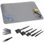 Ovaj svestrani bezbrižni paket sadrži sve što vam je potrebno za rad s elektronikom! Radna prostirka presvučena vinilom ima otpornost na curenje od 10 na 7 – 10 na 9 ohma, otporna je na abraziju i ima određenu osnovnu otpornost na toplinu, poput kapanja lema. Veličina i oblik prostirke koji je orijentiran na praksu pokazao se kao prednost pri radu - u lijevom i desnom kutu nalazi se tipka od 10 mm na koju se može spojiti isporučena narukvica i priključak za uzemljenje. Uz žicu za uzemljenje isporučuje se i zaštitni kontaktni utikač prema njemačkom standardu, što inače čini mogućim avanturističke eksperimente s uzemljenjem ili kupnju dodatnog pribora za ispravno spajanje nepotrebnim. Set zaokružuju ESD pincete od presvučenog plemenitog metala, pet vodljivih plastičnih pinceta i pet vodljivih ESD četkica koje sprječavaju nakupljanje napona čak i tijekom korištenja, primjerice prilikom uklanjanja prašine s modula.