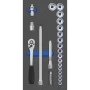 MTS-R / V (570x390 mm): utični ključ 10 (3/8). Dvobojni MTS umetak s 22 komada. Komplet ključeva. S polugom remenice. Umetnuti ključevi, dvostruki šesterokut: 6 - 7 - 8 - 9 - 10 - 11 - 12 - 13 - 14 - 15 - 16 - 17 - 18 - 19 - 20 - 21 - 22 mm. Kardanski zglob, produžeci u 125, 250 mm, proširenje na 12,5 (1/2). Napravljen od kromiranog vanadij čelika. Svi utični ključevi s praktičnim poprečnim natezanjem i SuperChrom premazom za finiju površinsku obradu i jaku otpornost na oštećenja, ogrebotine itd. Sa SmartDrive profilom koji štiti glave vijka i matica, jer se sila prenosi na bokove, a ne na uglove. Pogodno za kolica RATIO i VARIO, s praznim modulima i za QUADRO.