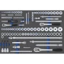 MTS-R / V (570x390 mm): Ključ nasadni XL. Dvobojni MTS umetak od mekane pjene sa 120 komada. Garnitura nasadnih ključeva 6,3 (1/4) - 10 (3/8) - 12,5 (1/2). S reverzibilnim čegrtaljkama u poluzi u 6,3 (1/4) + 10 (3/8) + 12,5 (1/2). Sadržaj 6.3 (1/4): Nasadni ključ ubacuje šesterokut u: 4 - 4,5 - 5 -5,5 - 6 - 7 - 8 - 9 -10 - 11 - 12 - 13 - 14 mm. Kardanski zglob, nastavci u 50, 100 mm, ručka s kliznim dijelom, utična ručka. Utičnice odvijača, s prorezima: 4 - 5,5 - 7 x 32 mm. Utičnice za odvijač Phillips: PH 1 - PH 2 - PZ 1 - PZ 2 x 32 mm. Šesterokutne nasadne ključeve odvijača: 3 - 4 - 5 - 6 - 8 x 32 mm Šesterokutne nasadne ključeve: E4 - E5 - E6 - E7 - E8 - E10 - E11. Šesterokružne čahure za odvijače: T8 - T10 - T15 - T20 - T25 - T27 - T30 - T40 x 32 mm. Sadržaj 10 (3/8): Ključ sa nasadnim ključem ubacuje šesterokut u: 6 - 7 - 8 - 9 - 10 - 11 - 12 - 13 - 14 - 15 - 16 - 17 - 18 - 19 - 21 - 22 mm. Univerzalni zglob, nastavci 125, 250 mm. Ručka s klizačem. Sadržaj 12,5 (1/2): Ključ sa nasadnim ključem ubacuje šesterokut u: 10 - 11 - 12 - 13 - 14 - 15 - 16 - 17 - 18 - 19 - 22 - 24 - 27 - 30 - 32 mm. Kardanski zglob, nastavci u 75, 250 mm. Izrađena od krom vanadij čelika. Svi ulošci nasadnih ključeva s praktičnim poprečnim nazubljenjem (od 10 (3/8)) i SuperChrome premazom za finiju površinsku obradu i snažnu otpornost na oštećenja, ogrebotine itd. S SmartDrive profilom koji štiti glave vijaka i navrtki, kao sila na bokovima se prenosi a ne na uglovima. Pogodno za kolica za radionice RATIO i VARIO.