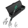 4-dijelni Click-Torque set moment ključeva s tri samopodesiva Joker umetnuta ključa. Za pravilno pritezanje vijčanih spojeva kod montaže i popravka rashladnih i klimatizacijskih sustava kao i dizalica topline. Moment ključ Click u nepogrešivom Wera dizajnu. Vrlo robustan dizajn s visokom preciznošću u skladu s DIN EN ISO 6789-1:2017-07. Jednostavno postavljanje i spremanje zadane vrijednosti. Zvučno i taktilno zaključavanje kada se dosegnu vrijednosti ljestvice također olakšava sigurno postavljanje željene vrijednosti momenta. Robusni mehanizam za okidanje jamči jasan zvučni i taktilni signal za okidanje kada se postigne postavljeni okretni moment. Za zatezanje s desne i lijeve strane i s četvrtastim utičnicom 14x18 mm za držanje odgovarajućih alata za utičnice. Tri samopodesiva Joker umetnuta ključa 7880 zamjenjuju nekoliko pojedinačnih dimenzija viljuškastih ključeva zahvaljujući neprekidno i paralelno vođenim čeljustima. Potrebna veličina se kontinuirano prilagođava kada ga pričvrstite na šesterokutnu maticu ili vijak. Funkcija čegrtaljke osigurava brzo i dosljedno zavrtanje bez zaustavljanja. Korištenjem prizmi kutne širine može se postići kut zakretanja unazad od samo 30°.
